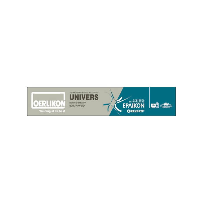 Ηλεκτρόδιο Oerlikon (Έρλικον) Univers. Βασικού τύπου με παχιά επένδυση. Βασικό ηλεκτρόδιο με υψηλή αντοχή σε κρούση, κατάλληλο για στιβαρές και με μεγάλες ενώσεις κατασκευές, ακόμα και από πολύ ανθρακούχους χάλυβες.