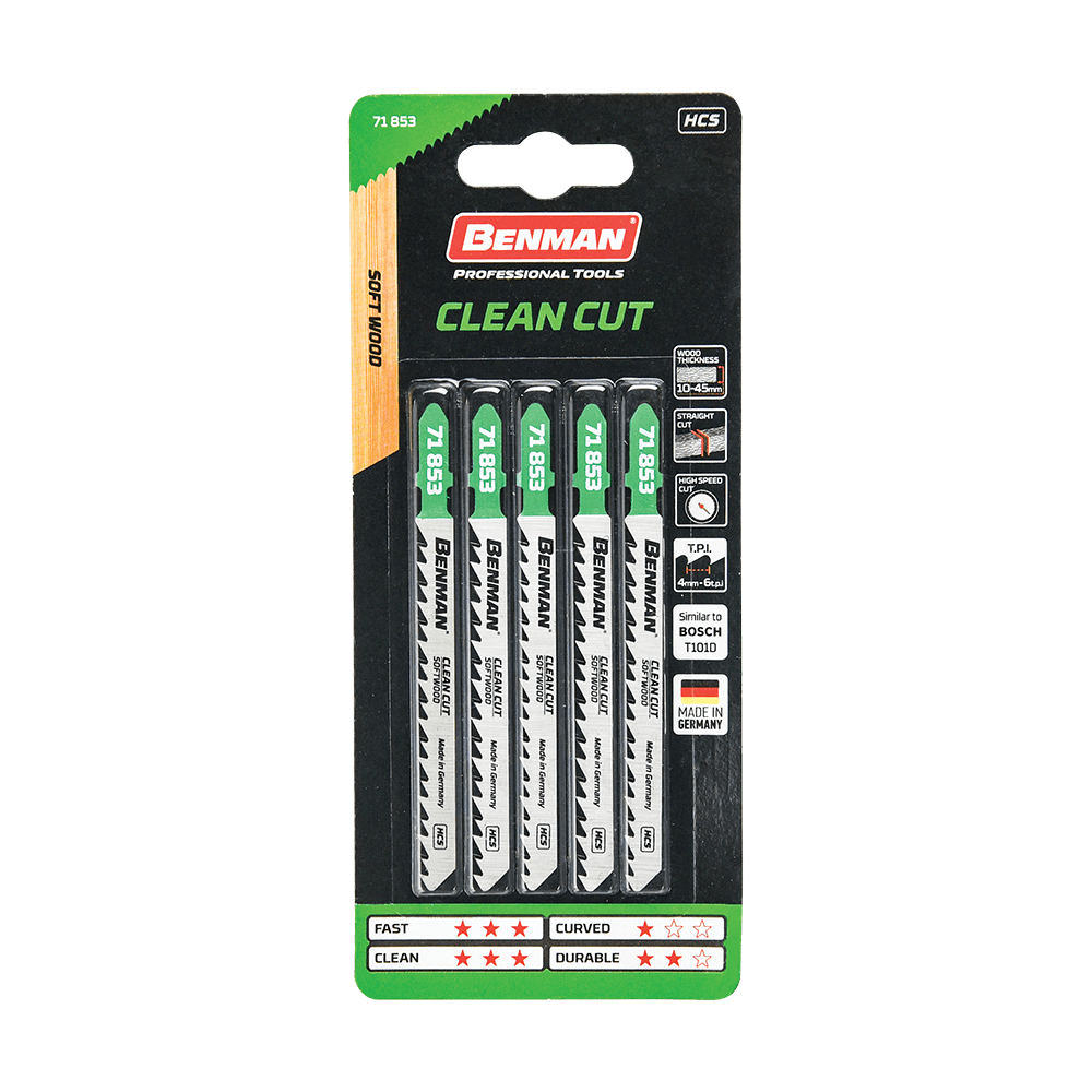 Σετ πριονόλαμες Clean Cut για μαλακό ξύλο Benman (5 τεμ). Τύπος T101 D, μήκος 100 mm, πλάτος 7.8 mm, πάχος 1.5 mm. Τροχισμένη, οδόντωση ανοιχτής γωνίας, Γερμανίας.