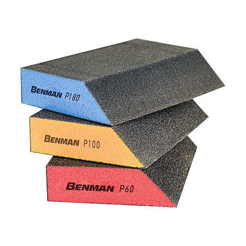 Τάκοi σφουγγάρι 4 πλευρών Benman, made in U.K.. Εύκαμπτοι με εύκολο κράτημα είναι ιδανικoί για γυψοσανίδες, ξύλο, μέταλλο, πλαστικό και βαμμένες επιφάνειες, ξεπερνώντας σε απόδοση το παραδοσιακά γυαλόχαρτα. Δεν περιέχουν διαλύτες και είναι εύκολοι στην εργασία σε δυσπρόσιτα σημεία.