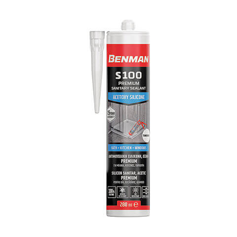 Όξινη αντιμουχλική σιλκόνη Benman Premium S100 που ωριμάζει με την υγρασία, ειδικά σχεδιασμένη για τη σφράγιση σε είδη υγιεινής. Παρουσιάζει εξαιρετική πρόσφυση σε μία ποικιλία μη πορωδών υποστρωμάτων όπως αλουμίνιο, εφυαλωμένα κεραμικά πλακίδια και γυαλί. Ιδανική για σφράγιση σε υγρές περιοχές, μπανιέρες και ντους, υαλοπίνακες και κεραμικά πλακάκια. Κατάλληλη για κατασκευές κουζίνας και μπάνιου και για τοποθετήσεις νεροχυτών χωρίς χείλος. Η S100 είναι υψηλής αντοχής σιλικόνη που δεν περιέχει διαλύτες και είναι ανθεκτική στο όζον, στην υπεριώδη ακτινοβολία, στη μούχλα, στους μύκητες, στην υγρασία και στις ακραίες θερμοκρασίες.