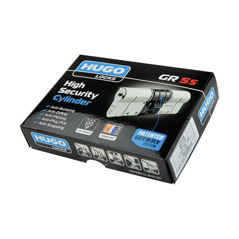 Κύλινδροι υπερασφαλείας Hugo GR 5S νίκελ, κατασκευασμένοι σύμφωνα με τις προδιαγραφές του UNI EN 1303, με ενσωματωμένο σύστημα ασφαλείας GATE BLOCK που μπλοκάρει την παραβίαση. Διαθέτουν μπάρα μπλοκαρίσματος από ειδικό κράμα σίδηρου για πρόσθετη ασφάλεια σε περίπτωση που δεχτούν επίθεση. Ο πείρος ασφαλείας ενεργοποιεί αυτόματα το μπλοκάρισμα του κυλίνδρου εμποδίζοντας την παράνομη είσοδο ενώ ο κύλινδρος συνεχίζει να λειτουργεί από μέσα με το κλειδί. Ο κύλινδρος διαθέτει 11 πειράκια (6 κύρια και 5 πλαϊνά), 9 ατάλινα πειράκια που εμποδίζουν το τρύπημα και 2 εγκοπές ασφάλισης στο περίβλημα για να σπάει εύκολα ώστε να προστατεύιει τον εσωτερικό μηχανισμό κλειδώματος της πόρτας. Η συσκευασία περιλμβάνει 5 κλειδιά ενώ υπάρχουν 291.140 διαφορετικοί συνδυασμοί κλειδιών. Ο κωδικός για το άκοπο κλειδί 010-60097.