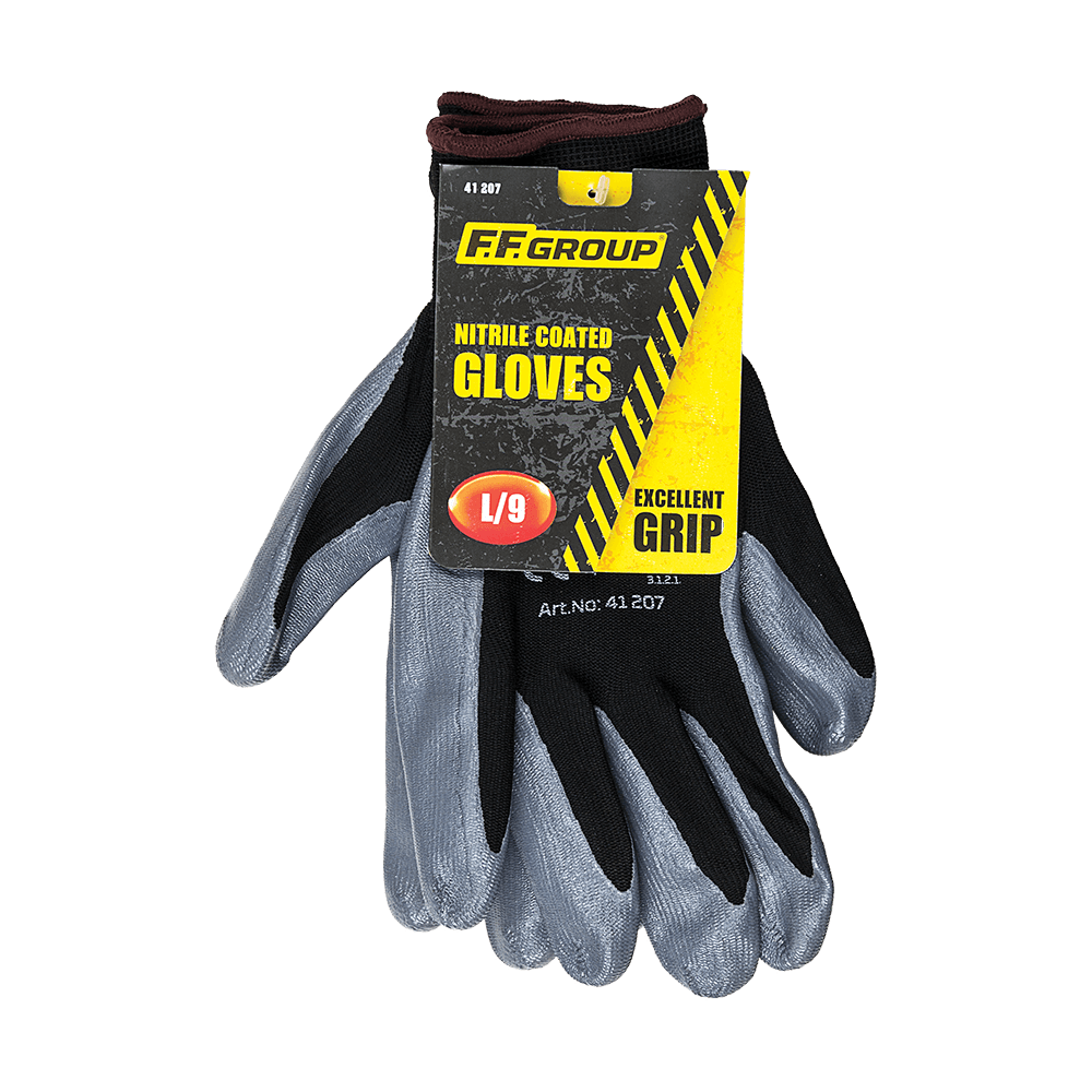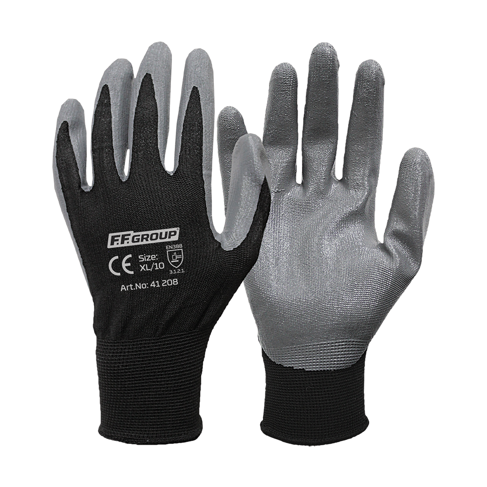Γάντια με πολυεστερική πλέξη και επικάλυψη νιτριλίου FF Group. Επικάλυψη μαλακού νιτριλίου (NBR) στην παλάμη για αντοχή στην τριβή και το κόψιμο. Ιδανικά για τζαμάδες. σιδεράδες. ηλεκτρολόγους. 13g πολυεστερική μαλακή πλέξη & πλεκτή μανσέτα. Το χρώμα αλλάζει μόνο στη μανσέτα του γαντιού. EN 388: 2016.