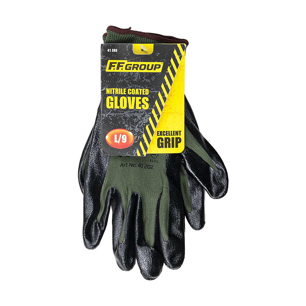 Γάντια με πολυεστερική πλέξη και επικάλυψη νιτριλίου FF Group. Επικάλυψη μαλακού νιτριλίου (NBR) στην παλάμη για αντοχή στην τριβή και το κόψιμο. Ιδανικά για τζαμάδες. σιδεράδες. ηλεκτρολόγους. 13g πολυεστερική μαλακή πλέξη & πλεκτή μανσέτα. Το χρώμα αλλάζει μόνο στη μανσέτα του γαντιού. EN 388: 2016.