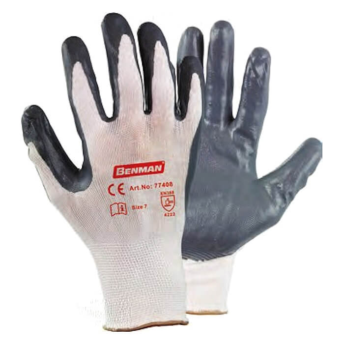 Γάντια νιτριλίου με ναυλον πλέξη Benman. Επικάλυψη νιτριλίου (NRB) στην παλάμη για αντοχή στην τριβή και στο κόψιμο. Ιδανικά για τζαμάδες, σιδεράδες, ηλεκτρολόγους. Νάιλον μαλακή πλέξη & λάστιχο στον καρπό.