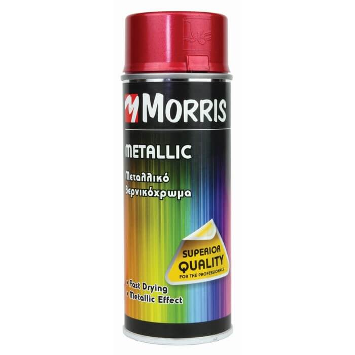Σπρέυ (σπρέι) μεταλλιζέ βερνικόχρωμα 400ml Morris. Γρήγορο στέγνωμα. Μεταλλικό εφέ. Ανθεκτικό στις γραντζουνιές και τις καιρικές συνθήκες. Κατάλληλο για: ξύλο, μέταλλο, αλουμίνιο, γυαλί, πέτρα, και διάφορους τύπους πλαστικού. Σε διάφορες αποχρώσεις. Αντοχή σε θερμοκρασίες ως 110°C. Προσφέρεται σημαντική έκπτωση για αγορά κούτας 6 τεμαχίων.
