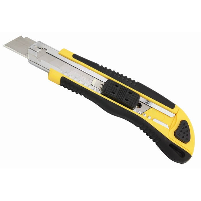 Κόφτης μοκέτας αυτόματος με λάστιχο και βίδα σταθεροποίησης FF Group. Η συσκευασία περιλαμβάνει 1+4 ανταλλακτικές λάμες. Επιπλέον ανταλλακτικές λάμες 18 mm με κωδικό 010-23389.