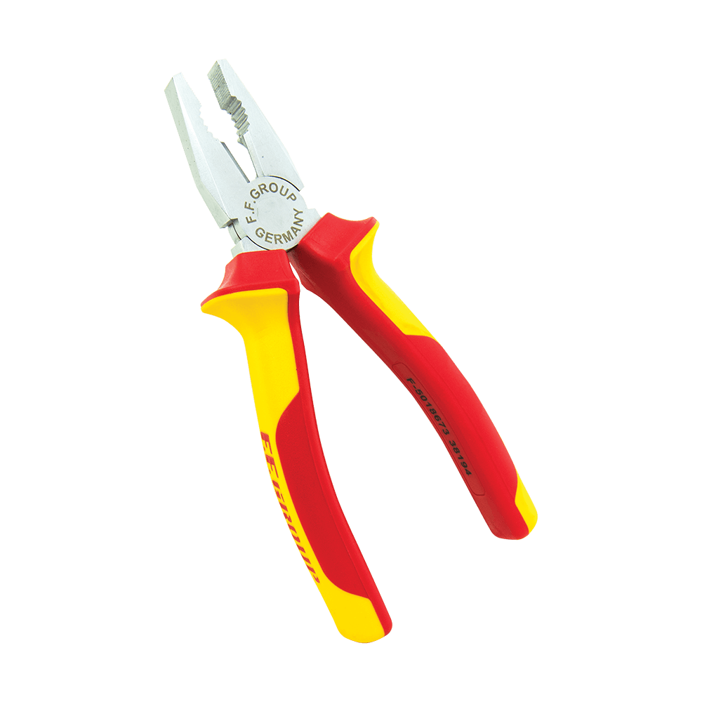 Πένσα VDE FF Group. Κατασκευασμένη σύμφωνα με το πρότυπο EΝ 60900: 2004, με πιστοποίηση VDE/GS (1000V). Από υψηλής ποιότητας χρωμοβανάδιο. Σφυρήλατο, ολικά σκληρυμένο με θερμική επεξεργασία. Μονωμένο με δίχρωμη λαβή δύο υλικών.