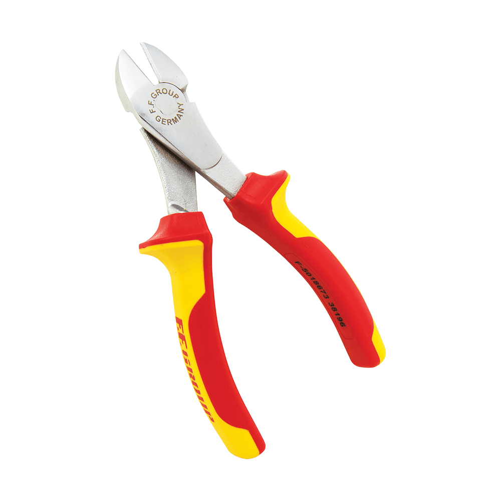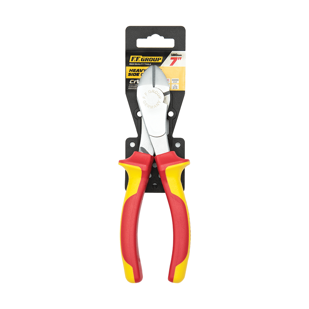 Πλαγιοκόφτης βαρέως τύπου VDE FF Group. Μήκος 180 mm. Κατασκευασμένος σύμφωνα με το πρότυπο EΝ 60900: 2004, με πιστοποίηση VDE/GS (1000V). Από υψηλής ποιότητας χρωμοβανάδιο. Σφυρήλατο, ολικά σκληρυμένο με θερμική επεξεργασία. Μονωμένο με δίχρωμη λαβή δύο υλικών.