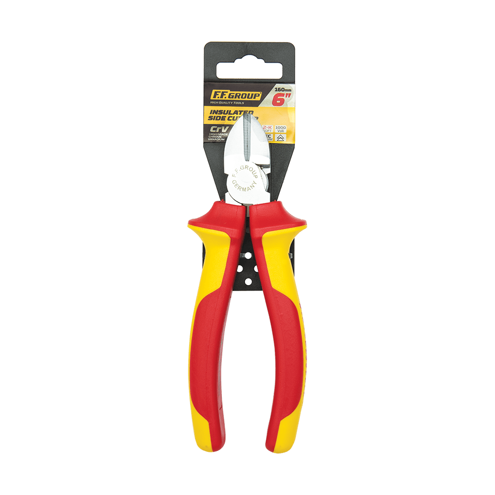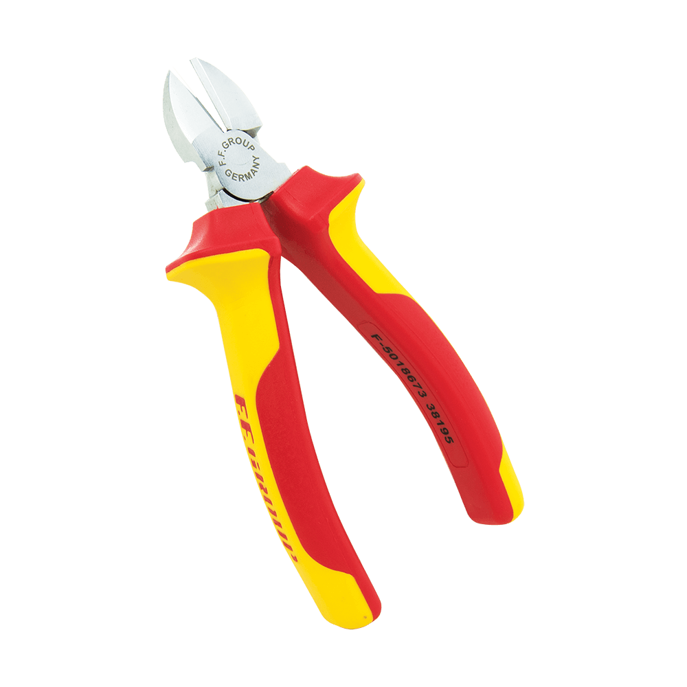 Πλαγιοκόφτης VDE FF Group. Μήκος 160 mm. Κατασκευασμένος σύμφωνα με το πρότυπο EΝ 60900: 2004, με πιστοποίηση VDE/GS (1000V). Από υψηλής ποιότητας χρωμοβανάδιο. Σφυρήλατος, ολικά σκληρυμένος με θερμική επεξεργασία. Μονωμένος με δίχρωμη λαβή δύο υλικών.