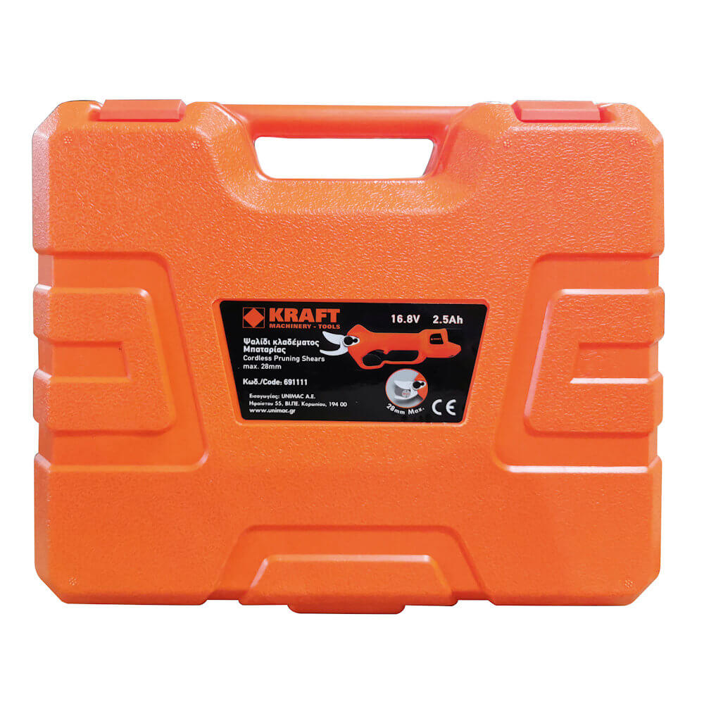 Κλαδευτήρι μπαταρίας Kraft 691111. Περιλαμβάνει: 1 μπαταρία λιθίου 2.5Ah, 1 φορτιστή, βαλιτσάκι μεταφοράς. Εφεδρική μπαταρία με κωδικό 011-692141.