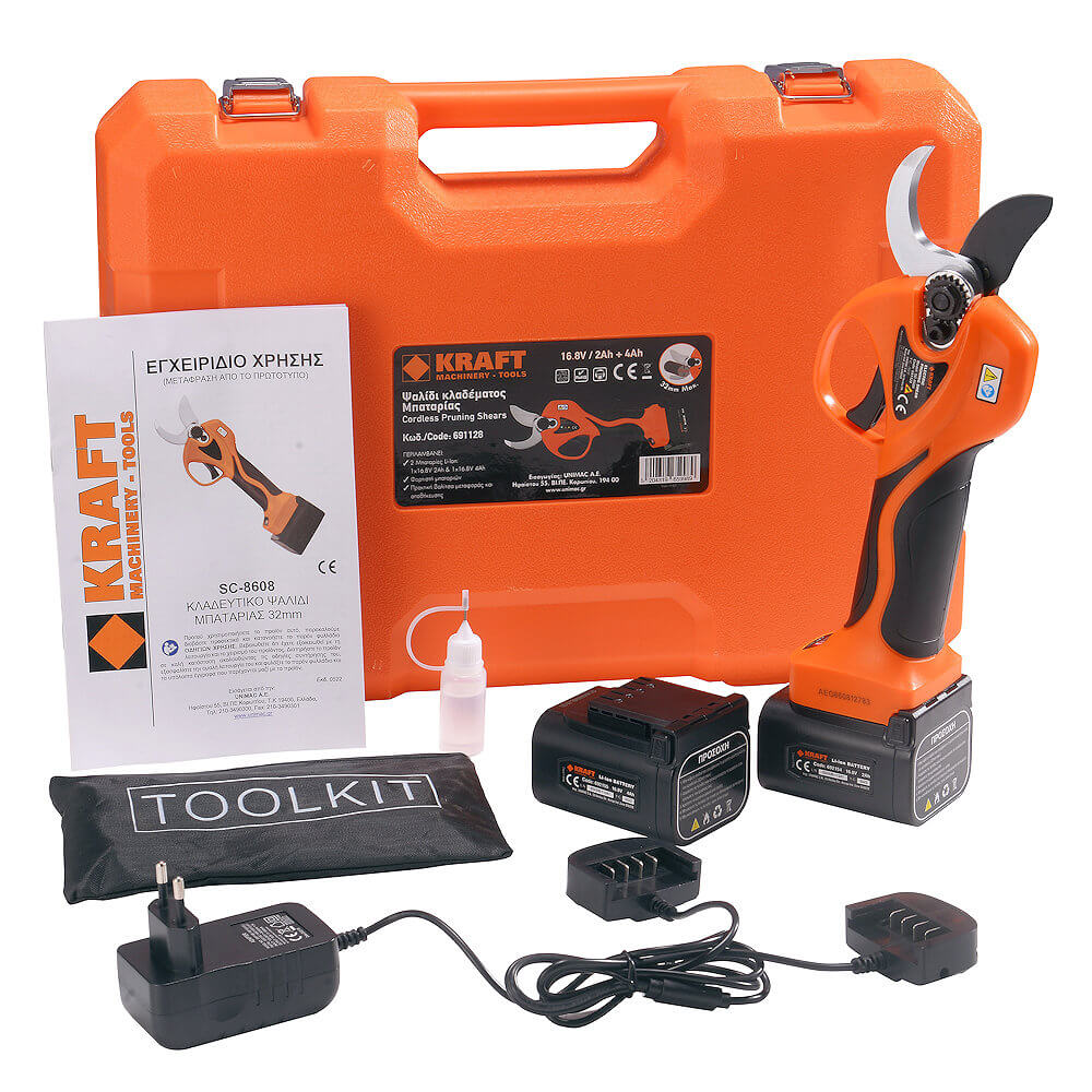 Κλαδευτήρι μπαταρίας Kraft 691128. Περιλαμβάνει: 1 μπαταρία λιθίου 2Ah, 1 μπαταρία λιθίου 4Ah 1 φορτιστή, βαλιτσάκι μεταφοράς. Εφεδρικές μπαταρίες με κωδικούς 011-692154, 011-692155. Προαιρετική προέκταση μήκους 1500 - 2100 mm με κωδικούς 011-691140.
