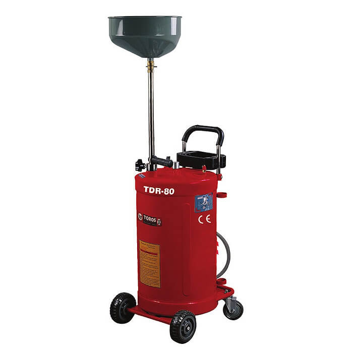 Συλλέκτης λαδιού Toros TDR-80. Χωρητικότητα 80 Lt. Τροχήλατη λαδιέρα για τη συλλογή των λαδιών της μηχανής ή της βαλβολίνης τoυ κιβωτίου ταχυτήτων των οχημάτων. Άδειασμα του κάδου με πεπιεσμένο αέρα χαμηλής πίεσης 1 bar.