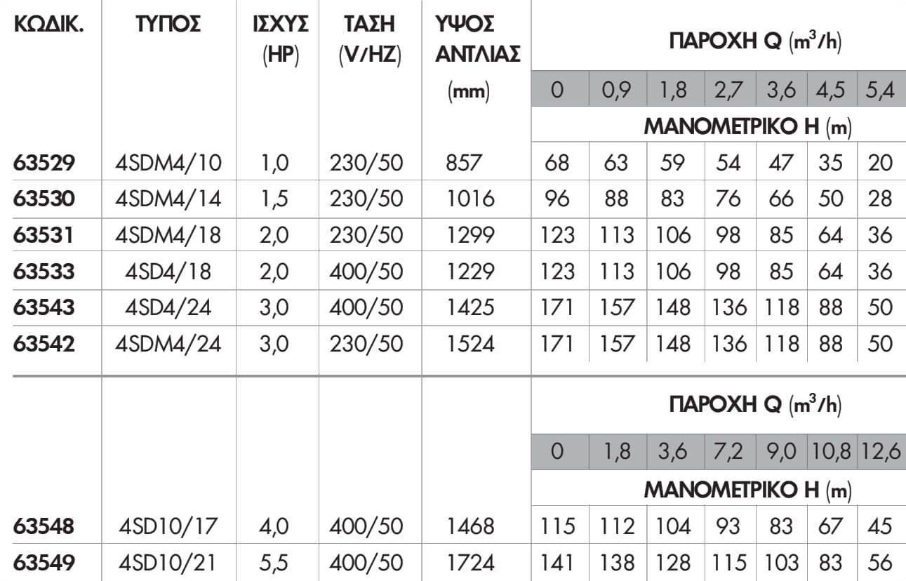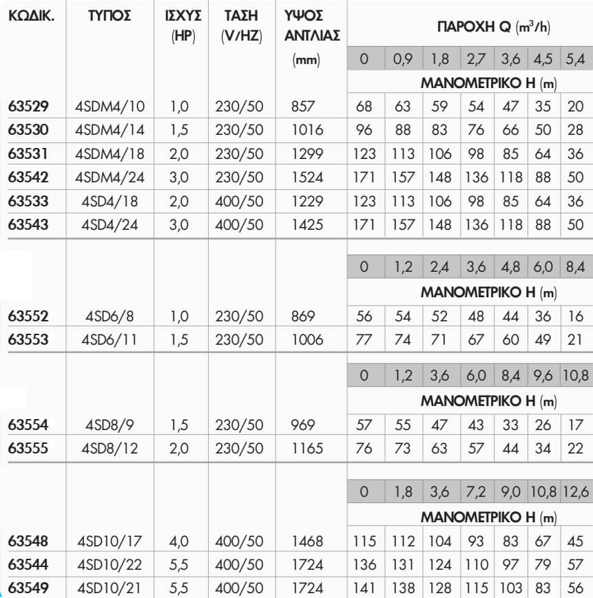 - Μέγιστη βύθιση της αντλίας 100m.