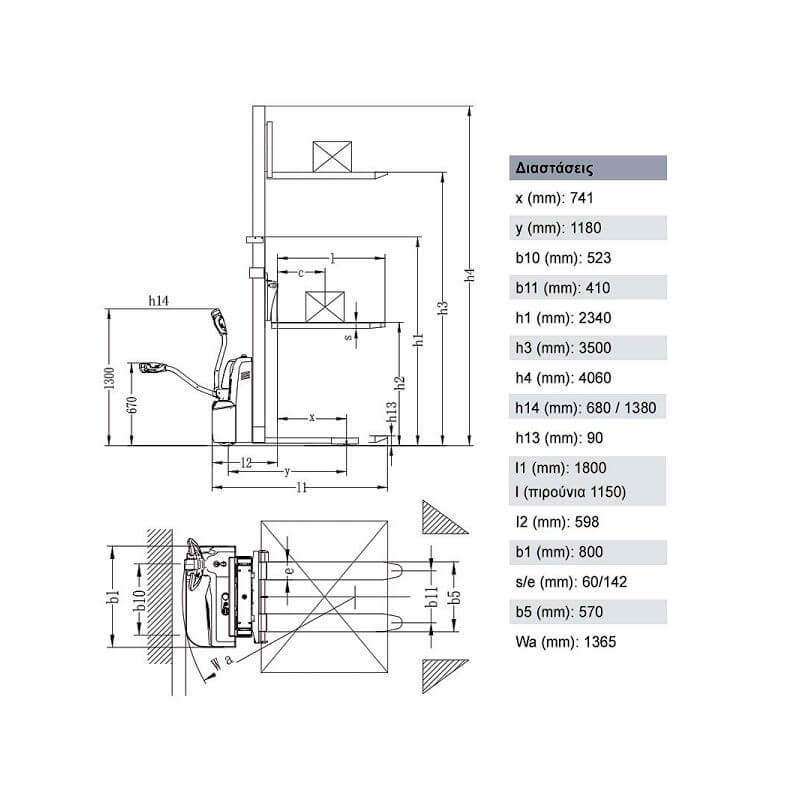 - Συνολικό ύψος: 4060 mm (με ανεβασμένα πιρούνια).