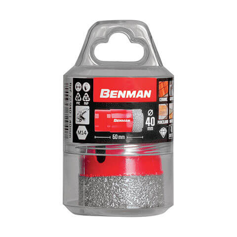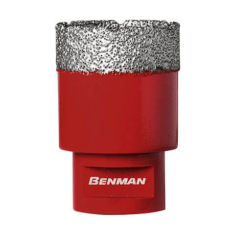 Διαμαντοκορώνες πλακιδίων Benman κατάλληλες για χρήση με γωνιακό τροχό (σπείρωμα Μ 14). Είναι ιδανικές για καθαρές και υψηλής ακρίβειας οπές σε κεραμικά, γρανίτη και μάρμαρο. Η τεχνολογία συγκόλλησης σε κενό αέρος προσφέρει ελάχιστες παραμορφώσεις του επεξεργαζόμενου υλικού λόγω της ομοιόμορφης θέρμανσης του κλίβανου συγκόλλησης. Ταυτόχρονα επιτυγχάνεται πολύ καλή ποιότητα σύνδεσης του τεχνητού διαμαντιού με το σώμα της διαμαντοκορώνας λόγω της συγκόλλησης σε κενό αέρος που προσδίδει στη διαμαντοκορώνα μεγάλη αντοχή ακόμα και σε υψηλές θερμοκρασίες λειτουργίας. Η υψηλή τεχνολογία κατασκευής τους συντελεί στην εύκολη αφαίρεση του επεξεργαζόμενου υλικού και στην αδιάκοπη εργασία χωρίς κούραση. Οι διαμαντοκορώνες Benman είναι ιδανικές για ηλεκτρολόγους, υδραυλικούς και πλακάδες.
