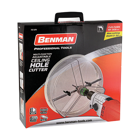 Ποτηροτρύπανο γυψοσανίδας Benman με ρυθμιζόμενο διαβήτη, κατάλληλο για κοπή στρογγυλών οπών σε οροφές, τοίχους και δάπεδα από κόντρα πλακέ, γυψοσανίδα, γύψο και ακρυλικά φύλλα. Βάθος κοπής από 5 mm έως 30 mm.