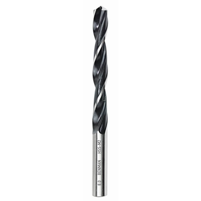Τρυπάνι αέρος μαύρο HSS-M2 DIN 338 Benman. 20% πιο γρήγορη διέλευση, εξ' αιτίας της ακονισμένης μύτης. 100% μεγαλύτερη αντοχή από τα κοινά τρυπάνια. Κατασκευασμένο από υψηλής ποιότητας ταχυχάλυβα (HSS M2). Ειδική θερμική επεξεργασία που προστατεύει από το σπάσιμο, ειδικά στα μικρά νούμερα. Γερμανίας.