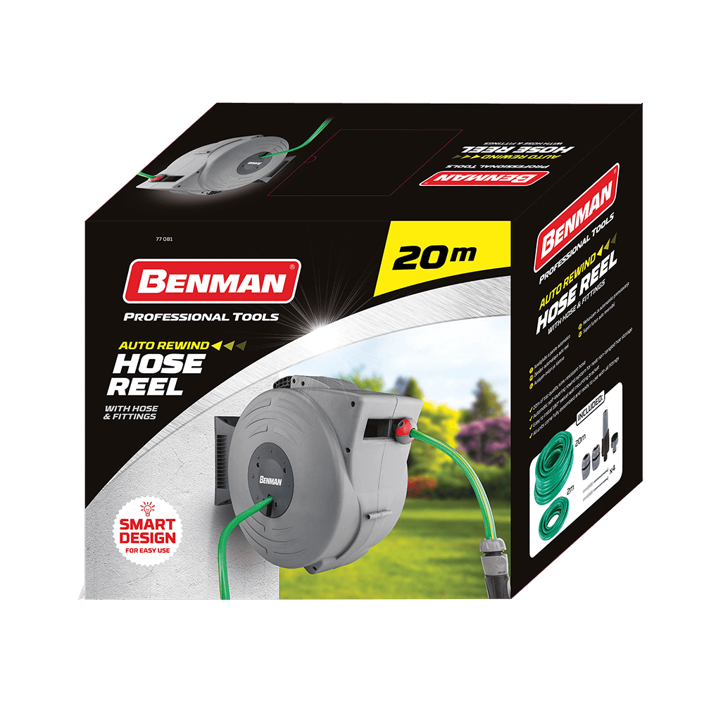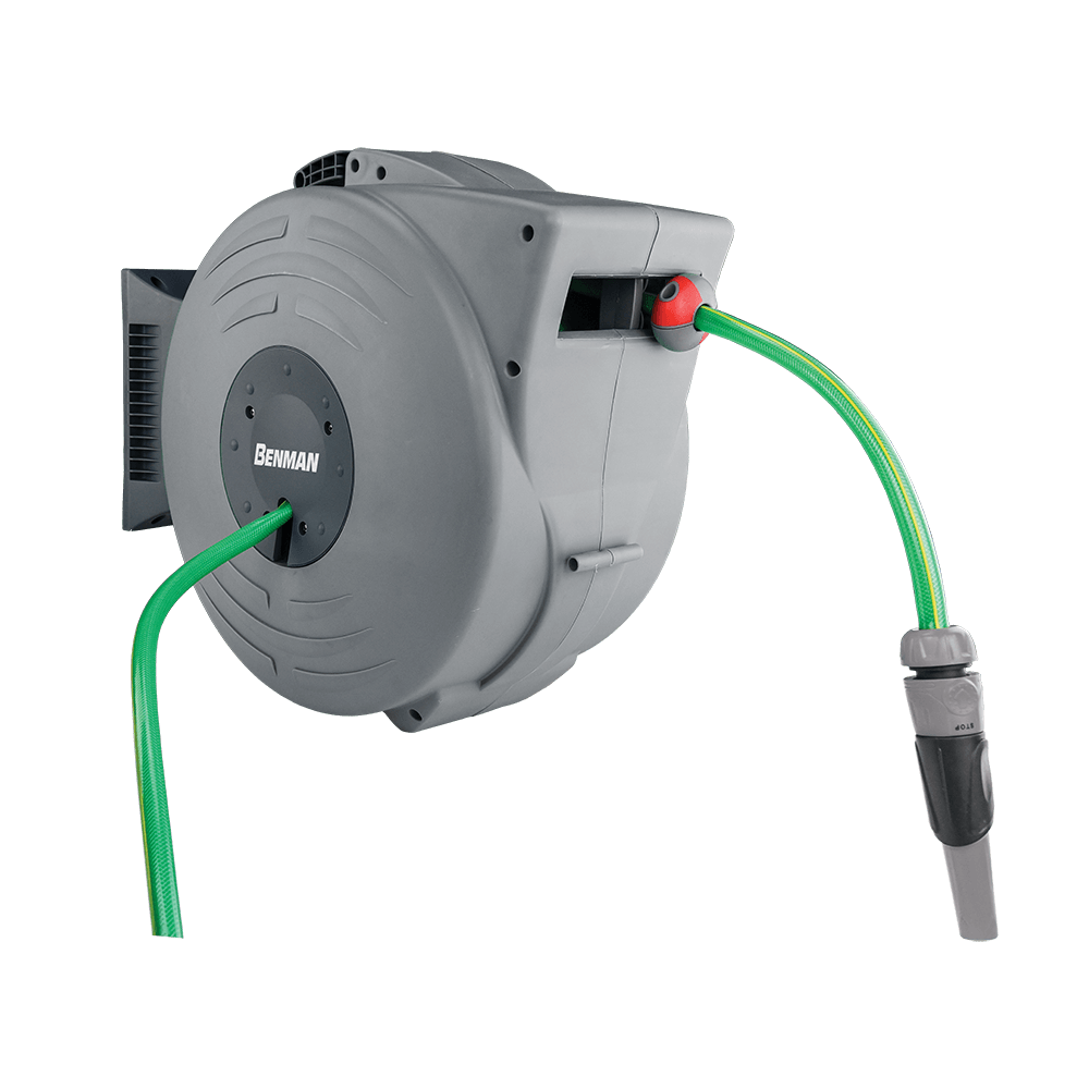 Αυτόματη ανέμη με λάστιχο Benman 20 m. Προσυναρμολογημένη με ενισχυμένο λάστιχο κήπου 20 m και συμπληρώνεται με τα εξαρτήματα του λάστιχου και του στηρίγματος τοποθέτησης στον τοίχο. Με μοναδικό μηχανισμό περιστροφής 180°, ο οποίος επιτρέπει την εξαγωγή του λάστιχου προς οποιαδήποτε κατεύθυνση.