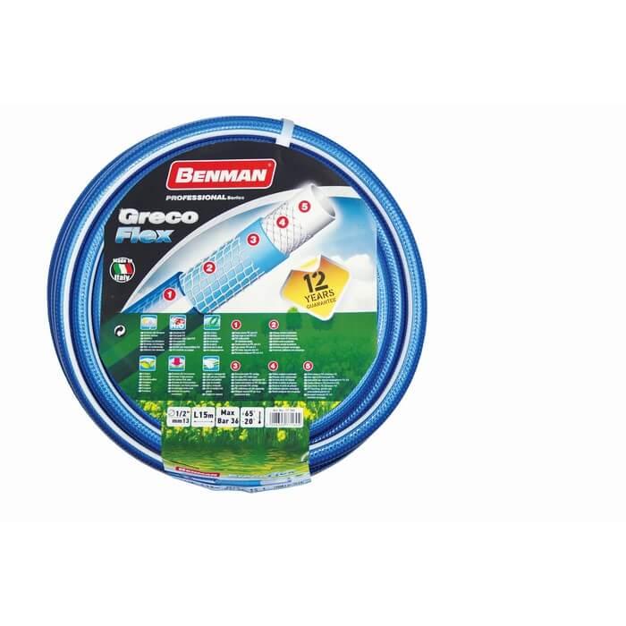 Λάστιχο ποτίσματος GrecoFlex Benman. Ιταλίας. Ανθεκτικό στην κακοκαιρία. Ανθεκτικό στις μεγάλες καταπονήσεις (ως 36 bar). Σύμφωνο με τον κανονισμό REACH, SVHC Free (<0.1%). Ελαφρύ και εύχρηστο. Δεν παραμορφώνεται. Οικολογικό.