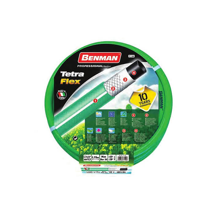 Λάστιχο ποτίσματος TetraFlex Benman. Ιταλίας. Με επίστρωση 4 υλικών. Σύμφωνο με τον κανονισμό REACH, SVHC Free (<0.1%).