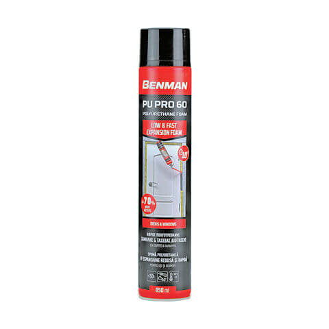 Αφρός πολυουρεθάνης Benman χειρός χαμηλής και ταχείας διόγκωσης PU PRO 60, ιδανικός για στεγανοποίηση αρμών οροφής, τοίχου, δαπέδου, κουφωμάτων, παραθύρων και πορτών. Συνιστάται η χρήση του για θερμομόνωση και ηχομόνωση. Ο αφρός πολυουρεθάνης Benman PU PRO 60 είναι ένας αφρός πολλαπλών χρήσεων με εξαιρετική πρόσφυση σε μεγάλο αριθμό τυπικών κατασκευαστικών υλικών όπως τούβλα, σκυρόδεμα, γύψο, ξύλο, μέταλλα, φελιζόλ, σκληρό PVC και άκαμπτο PUR. Παρέχει υψηλή απόδοση έως 60L, μειωμένη πίεση και αύξηση όγκου αφρού (μετά τη διόγκωση) και τυπική ευφλεκτότητα Εφαρμόζεται σε πολλαπλές θέσεις με κανονική πρόσφυση σε επιφάνειες.