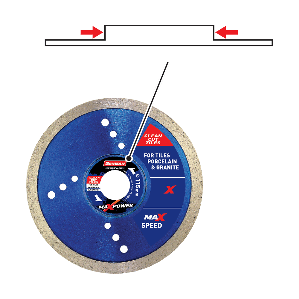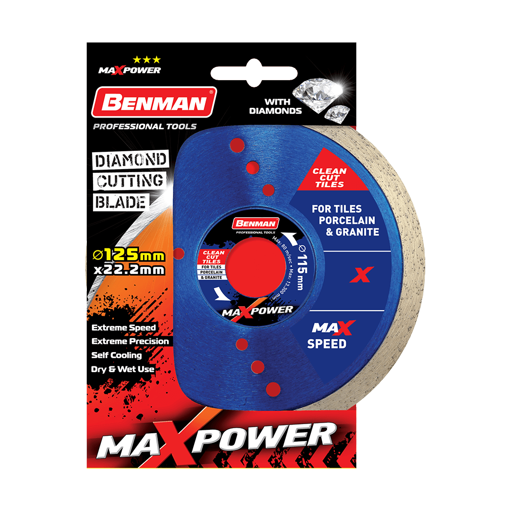 Διαμαντόδισκος Clean Cut Tiles Maxpower Benman. Κατάλληλος για πλακάκια, πορσελάνη και γρανίτη. Υψηλή ταχύτητα και καθαρότητα κοπής, για χρήση σε στεγνή ή υγρή επιφάνεια. Με φλάντζα, για καλύτερη ευστάθεια. Αερόψυκτος.