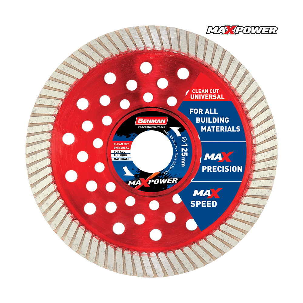 Διαμαντόδισκος Clean Cut Universal Maxpower Benman. Κατάλληλος για σκληρά πετρώματα, μπετό, γρανίτη, οικοδομικά υλικά. Υψηλή ταχύτητα κοπής. Απόλυτη ακρίβεια στη κοπή. Για χρήση σε στεγνή ή υγρή επιφάνεια. Αερόψυκτος.