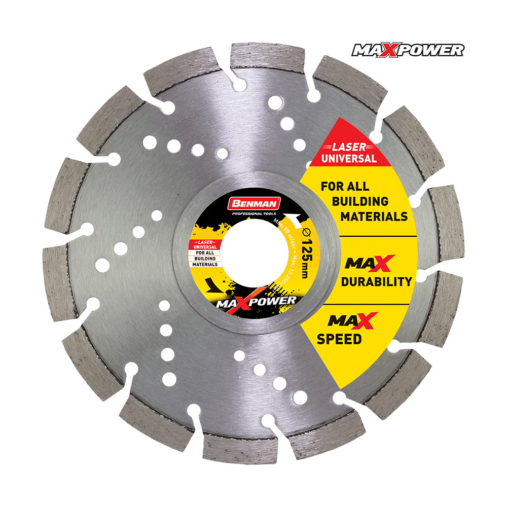 Διαμαντόδισκος Laser Universal Maxpower Benman. Κατάλληλος για οπλισμένο σκυρόδεμα, σκληρά πετρώματα, οικοδομικά υλικά. Υψηλή ταχύτητα κοπής. Απόλυτη ακρίβεια στη κοπή. Για χρήση σε στεγνή ή υγρή επιφάνεια. Αερόψυκτος, εξαιρετικής αντοχής.