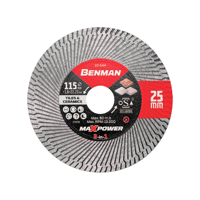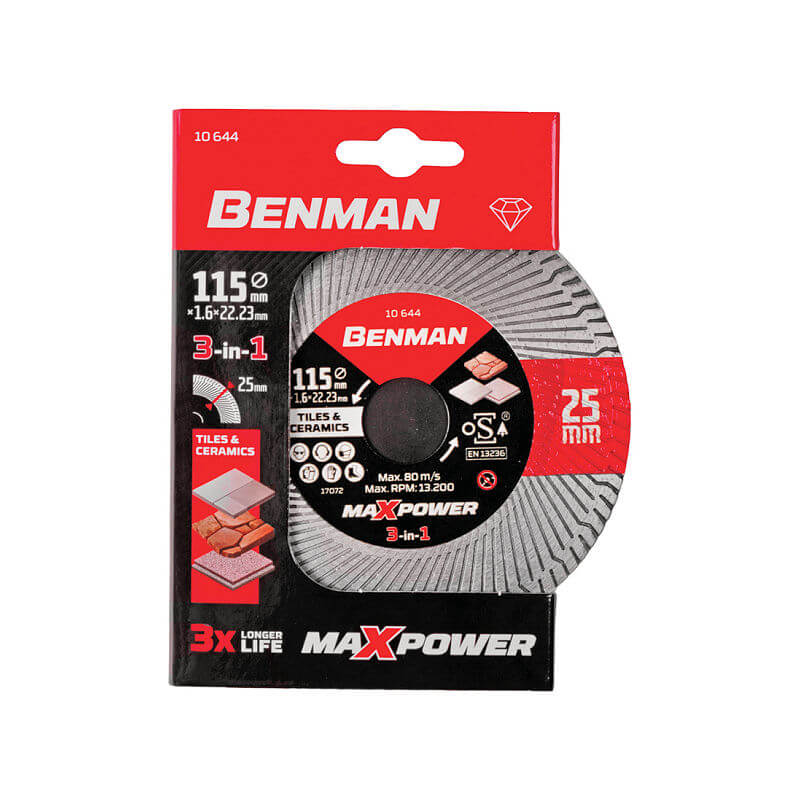 Διαμαντόδισκοι πλακιδίων 3-in-1 Benman Maxpower 3 λειτουργιών: κοπή στις 450, κοπή στις 900 και λείανση. Είναι ιδανικός για πλακάκια και πορσελάνη, σε στεγνή ή υγρή επιφάνεια. Ο δίσκος με διάμετρο 125 mm είναι κατάλληλος για κοπή γρανίτη έως 15 mm.
