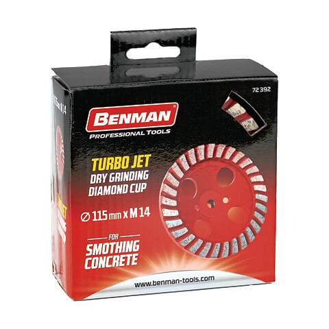 Διαμαντοτροχός λείανσης μπετόν Benman Turbo-Jet με σπείρωμα Μ14 και διάμετρο 115 mm, κατάλληλος για παλαιωμένο-σκληρό μπετόν και για φρέσκο-μαλακό μπετόν. Ο μεγάλος αριθμός δοντιών εξασφαλίζει σημαντικά πιο αθόρυβη λειτουργία, μεγάλη διάρκεια ζωής και καλύτερο φινίρισμα.