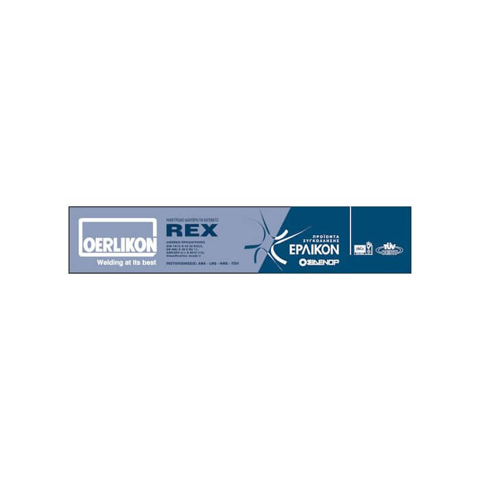 Ηλεκτρόδιο Oerlikon (Έρλικον) Rex. Τύπου ρουτιλίου-κυτταρίνης μέσης επένδυσης. Ηλεκτρόδιο χαμηλής θερμοκρασίας συγκόλλησης, με καλό κατεβατό.