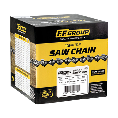 Αλυσίδα αλυσοπρίονου FF Group Semi-Chisel Ul σε ρολό 30.5 μέτρων γενικής χρήσης. Κατασκευασμένη σύμφωνα με προδιαγραφές ασφαλείας UL, για μειωμένο κίνδυνο ανάκρουσης. Ειδικά σχεδιασμένη για εξαιρετικά υψηλή ταχύτητα κοπής και ταχεία απομάκρυνση ρινισμάτων. Κάθε συσκευασία περιλαμβάνει 30 κουτιά ανασυσκευασίας και 60 συνδέσμους.