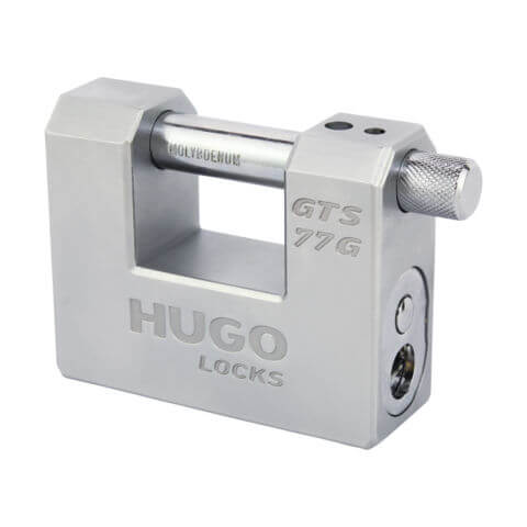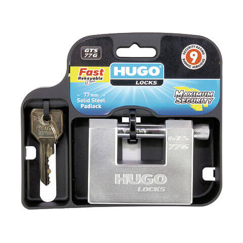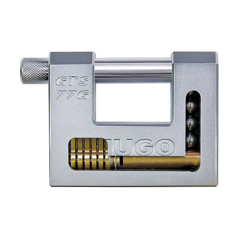 Ατσάλινος τάκος Hugo GTS 77G με επαναπρογραμματιζόμενο αφαλό GT και 3 κλειδιά. Σε περίπτωση απώλειας των κλειδιών μπορεί πολύ εύκολα να αντικατασταθεί ο αφαλός με ένα νέο ή να επαναπρογραμματιστεί ο ήδη υπάρχων αλλάζοντας θέση στα πειράκια. Ο επαναπρογραμματιζόμενος αφαλός διαθέτει 100.000 συνδυασμούς κλειδώματος και παρέχει υψηλή αντοχή στο τρύπημα και το βίαιο τράβηγμα χάρη στο ισχυρό σύστημα κλειδώματος με μπίλιες. Ο αφαλός περιλαμβάνει 2 επισκληρυμμένα πειράκια στο επάνω μέρος, 2 επισκληρυμμένα πειράκια στο κάτω μέρος, 2 επισκληρυμμένες μπάρες που εμποδίζουν το τρύπημα, 6 ορειχάλκινα πειράκια και πειράκια κατά του τραβήγματος και χτυπήματος Ο λαιμός είναι από επισκλυρημμένο μολυβδένιο για έξτρα δύναμη και αντοχή κατά της διάβρωσης. Το άκοπο κλειδί είναι R3.