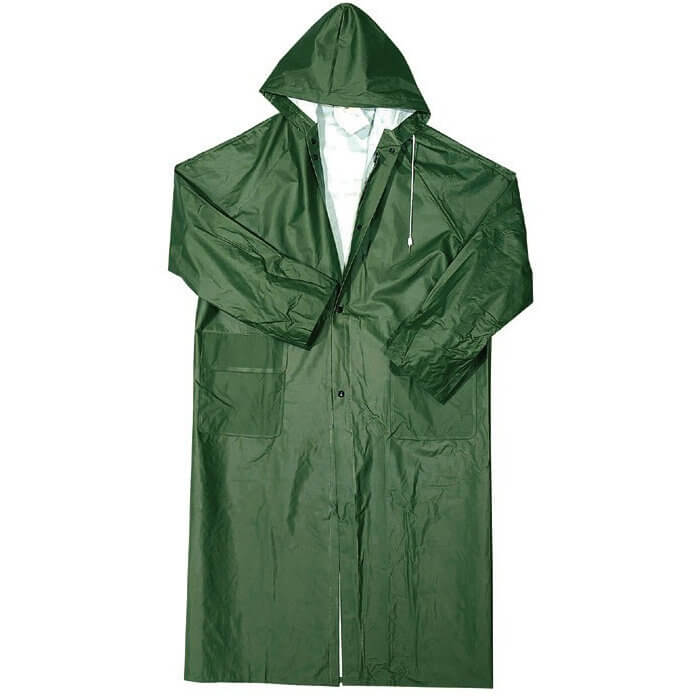 Αδιάβροχο πράσινο 135/V Unimac. Αδιάβροχο ραμμένο και συγκολλημένο, διπλής επίστρωσης από PVC / Πολυεστέρα / PVC πάχους 0.30 mm. Μακρύ παλτό με σταθερή κουκούλα και κάπα αερισμού στην πλάτη. Κλείσιμο με φερμουάρ, πατιλέτα με κουμπιά, καρποί με εσωτερικό λάστιχο και 2 μπροστινές τσέπες.