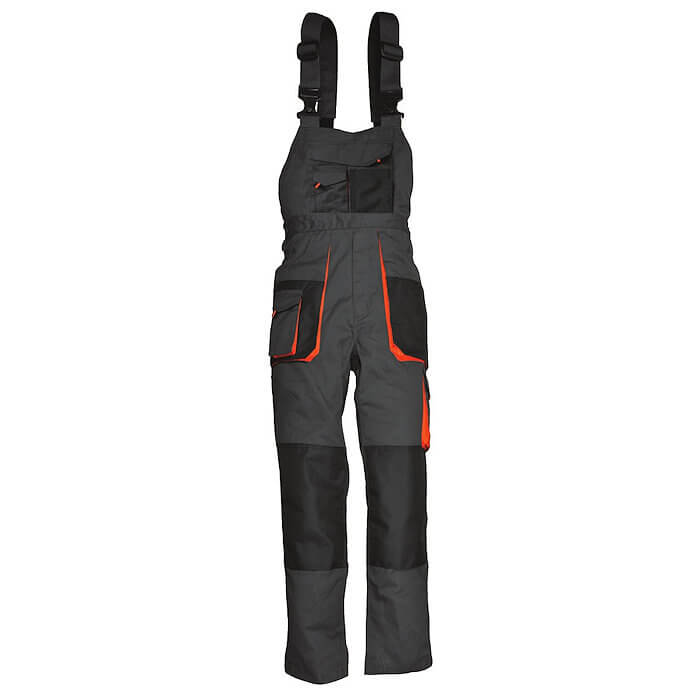 Φόρμα εργασίας με τιράντα Unimac 720119. Παντελόνι τιράντα γκρι, από T/C καμβά, 270 g/m². Με διακοσμητικό στις τσέπες και επιθέματα Oxford στα γόνατα που δέχονται επιγονατίδες. Με 11 τσέπες.