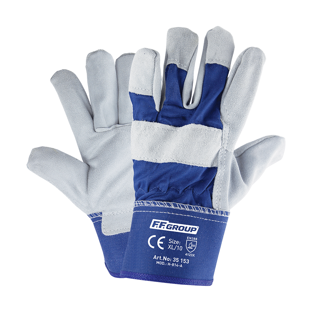 Γάντια δερματοπάνινα FF Group. Παλάμη από κρούτα μόσχου. Παλάμη από κρούτα μόσχου Α/Β ποιότητας. Πίσω μέρος γαντιού & μανσέτα από καλής ποιότητας βαμβακερό ύφασμα. Διπλές ραφές. Δυνατό και μαλακό. Μέγεθος 10".