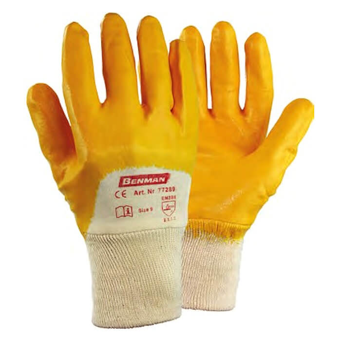 Γάντια με επικάλυψη νιτριλίου πάχους 0.9 mm Benman. Επικάλυψη νιτριλίου (NRB) για αξεπέραστη αντοχή στη διείσδυση λαδιών. Ύφασμα από 100% βαμβάκι. Λάστιχο στον καρπό για άριστη εφαρμογή.