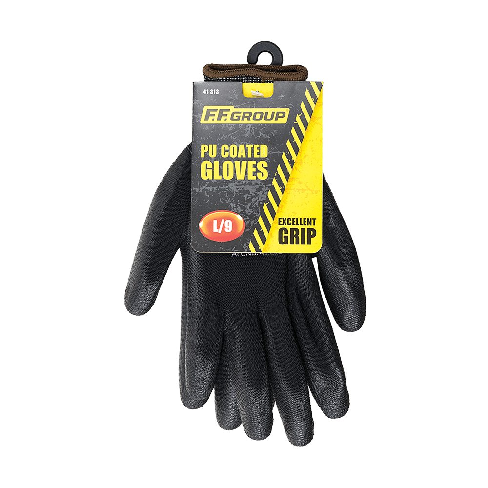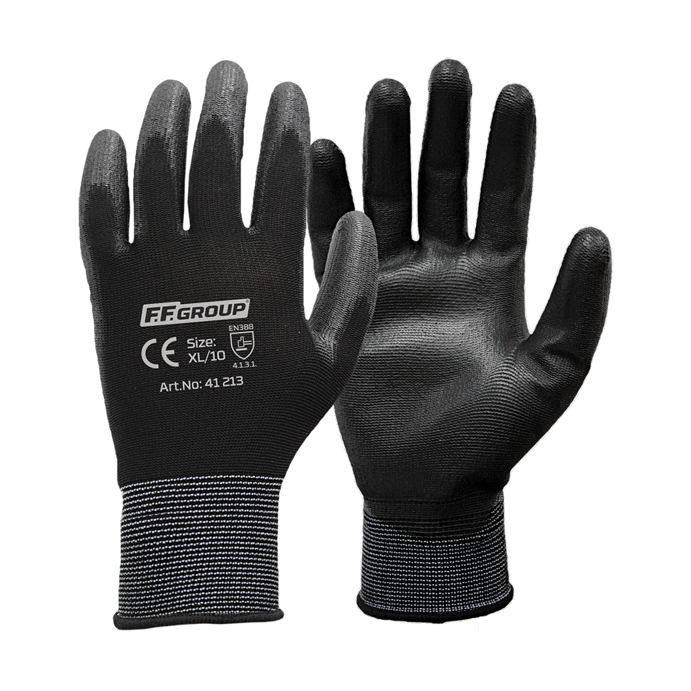 Γάντια με πολυεστερική πλέξη και επικάλυψη πολυουρεθάνης FF Group. Επικάλυψη πολυουρεθάνης (PU) στην παλάμη. για αντοχή σε τριβή και σχίσιμο. Ιδανικό για εργασίες που απαιτούν επιδεξιότητα. Πολύ εύκαμπτο. Aντιολισθητικό κράτημα. 13g πολυεστερική επένδυση & μανσέτα. Το χρώμα αλλάζει μόνο στη μανσέτα του γαντιού. EN 388: 2016.