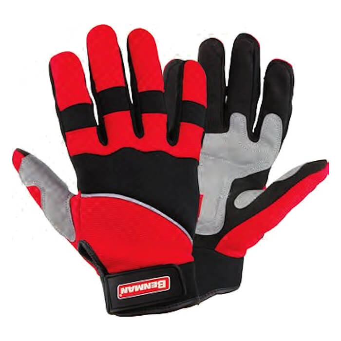 Γάντια υφασμάτινα με δερμάτινη ενίσχυση Benman. Ειδικά για μηχανικούς και μηχανουργούς. Αντίχειρας και δάκτυλα από ενισχυμένο συνθετικό δέρμα με υψηλή αντοχή στην τριβή. Αντικραδασμική παλάμη ενισχυμένη με EVA. Δύο στρώσεις ελαστικό ύφασμα και μανσέτα με velcro.