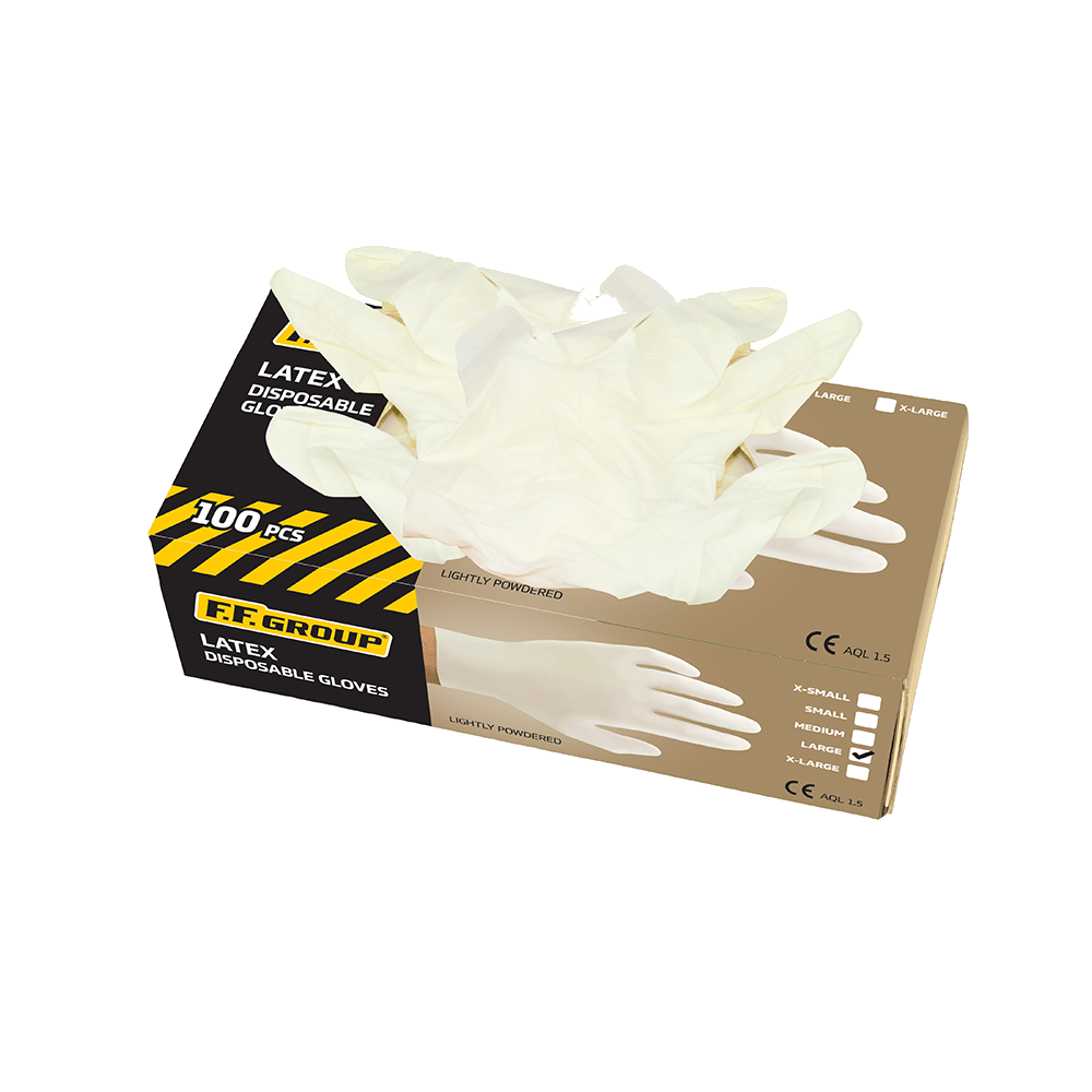 Σετ 100 τεμ γάντια latex μιας χρήσης FF Group. Γάντι από φυσικό Latex, αμφιδέξιο, αρίστης ποιότητας, ελαφρώς πουδραρισμένα. Τέλεια λαβή και ευαισθησία στην αφή. Με χαμηλό ποσοστό πρωτεϊνης latex. Πιστοποιημένο για χρήση στα τρόφιμα. Ελαφρώς πουδραρισμένα.