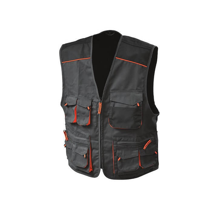 Γιλέκο εργασίας Unimac 720125. Γιλέκο εργασίας Από T/C καμβά, 270 g/m². Με διακοσμητικό στις τσέπες και επιθέματα Oxford στους ώμους. Κλείνει με φερμουάρ. Με δίχτυ στην πλάτη και με 11 τσέπες.