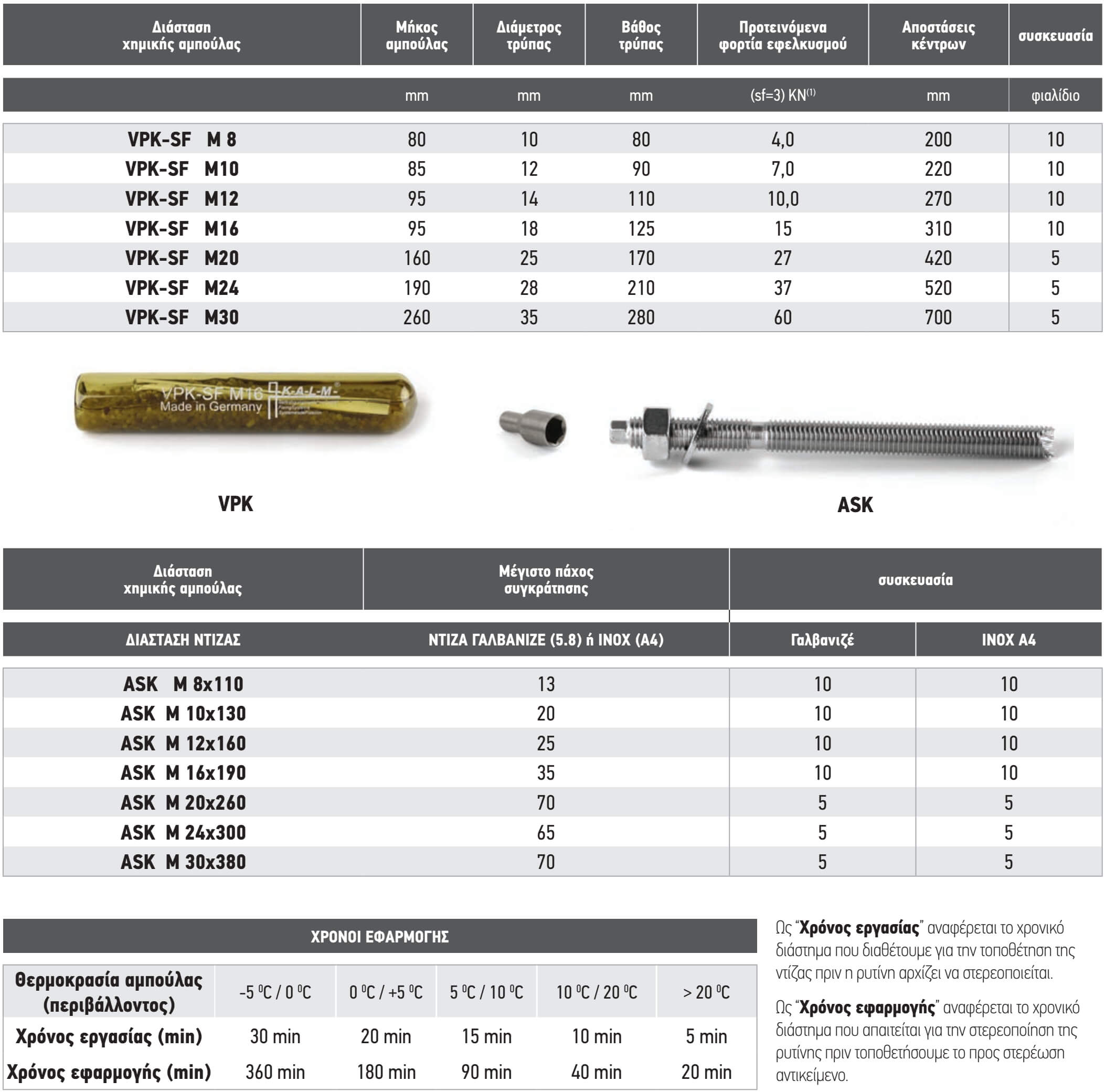 Τα “VPK-SF” είναι χημικά αγκύρια (βινυλεστέρας) συσκευασμένα σε γυάλινα φιαλίδια. Σε συνδυασμό με κατάλληλα διαμορφωμένη ντίζα προσφέρουν ένα άριστο σύστημα στερέωσης με υψηλές μηχανικές ιδιότητες για μεγάλο εύρος εφαρμογών. Δεν προφορτίζουν το μπετόν, επιτυγχά- νουν ακρίβεια στη δοσολογία της ρητίνης, ενώ συγχρόνως στεγανοποιούν την εφαρμογή. Βρίσκουν εφαρμογή σε συμπαγή υλικά (μπετόν,πέτρα, κλπ).