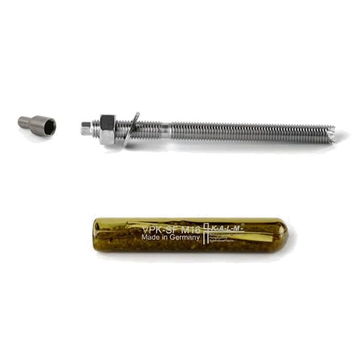 Χημικό αγκύριο KALM VPK-SF (φιαλίδιo). Πιστοποιημένο σύστημα αγκύρωσης σε μη ρηγματωμένο μπετόν σε συνεργασία με τα αντίστοιχα μπουζόνια. Βρίσκει εφαρμογή τόσο σε στεγνό όσο και σε υγρό περιβάλλον (και σε θαλασσινό νερό). Τα χημικά αγκύρια VPK-SF απαρτίζονται από ένα μείγμα ρητινών (βινυλεστέρα) και ενός σκληρυντικού (χωρίς στυρένιο που περιορίζει την χαρακτηριστική οσμή). Το προς στερέωση αντικείμενο (μπουζόνι) τοποθετείται στην οπή με την χρήση κρουστικού δράπανου, προκειμένου να σπάσει το φιαλίδιο και να αναμειχθούν ομοιόμορφα η ρητίνη με το σκληρυντικό. Το μείγμα γεμίζει το κενό μεταξύ του μπουζονιού και των τοιχωμάτων του μπετόν και μόλις στερεοποιηθεί (πίνακας θερμοκρασίας χρόνου) μπορούμε να εφαρμόσουμε φορτίο (σύμφωνα με τον αντίστοιχο πίνακα επιτρεπομένων φορτίων).