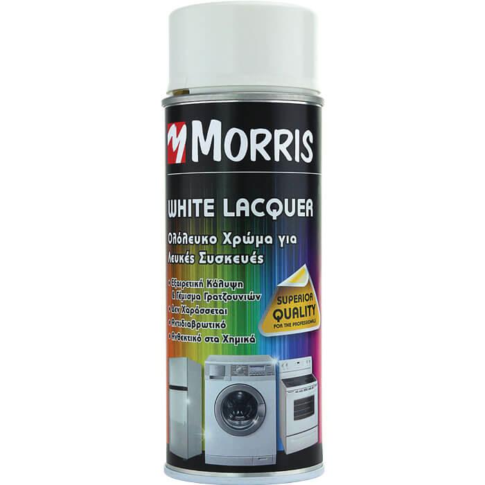 Σπρέυ (σπρέι) για οικιακές συσκευές 400ml Morris. Σε λευκό χρώμα. Αντέχει σε θερμοκρασίες ως 110°C. Στεγνώνει γρήγορα. Εξαιρετική κάλυψη και γέμιση χτυπημάτων. Αντισκωριακό. Ανθεκτικό στα χημικά. Προσφέρεται σημαντική έκπτωση για αγορά κούτας 6 τεμαχίων.