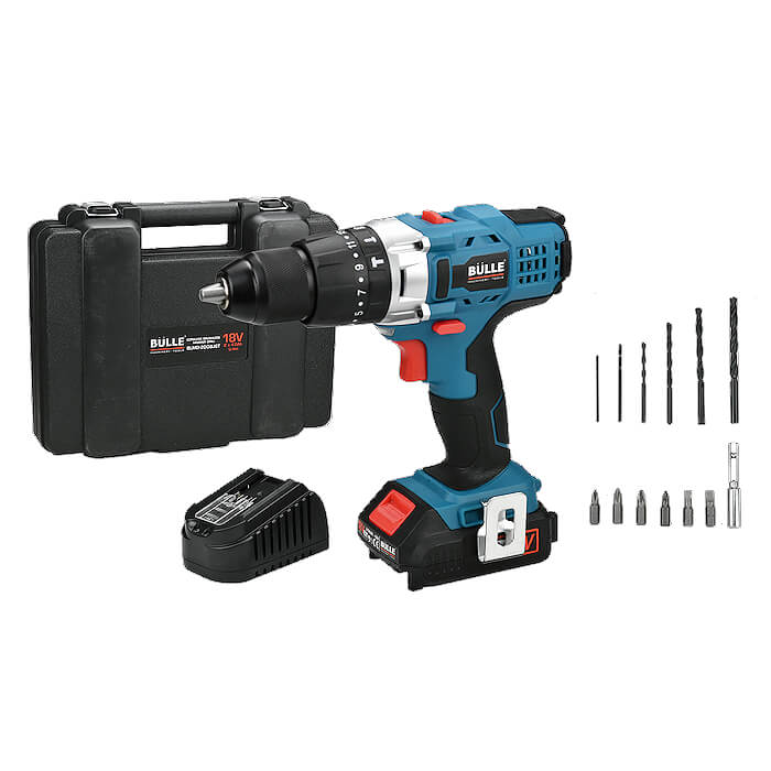 Κρουστικό δραπανοκατσάβιδο Bülle 633315, με δύο μπαταρίες λιθίου 4.0 Ah. Συνοδεύεται από βαλιτσάκι μεταφοράς και 13 εξαρτήματα.