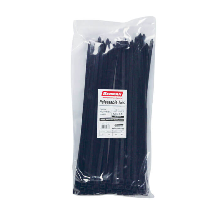 Δεματικά καλωδίων ανοιγόμενα Benman μαύρα. Διαθέτει μια ενσωματωμένη γλωττίδα απελευθέρωσης για να επιτρέπει στο δεματικό να παραμένει κλειδωμένο μέχρι να απελευθερωθεί σκόπιμα. Ιδιαίτερα κατάλληλα για καταστάσεις όπου απαιτείται προσωρινή στερέωση. Εύκολο στη χρήση, σύστημα απελευθέρωσης με πάτημα. Εξαιρετικά ανθεκτικό σε θαλασσινό νερό, πετρέλαιο, λίπη κ.λπ. Υλικό νάιλον 6.6 με θερμοκρασία λειτουργίας από -40°C ως +85°C. Διατίθενται στις παρακάτω διαστάσεις: