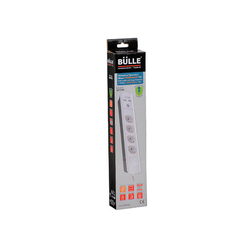 Πολύπριζα με διακόπτη και προστασία υπέρτασης 4 θέσεων και 2 θύρες USB Auto-Id. Διαθέτουν καλώδιο H05VV-F 3 x 1.5 mm, φωτιζόμενο διακόπτη, μηχανικό κλείδωμα πρίζας, προστασία υπέρτασης και δυνατότητα κρεμάσματος από πάνω ή από κάτω.