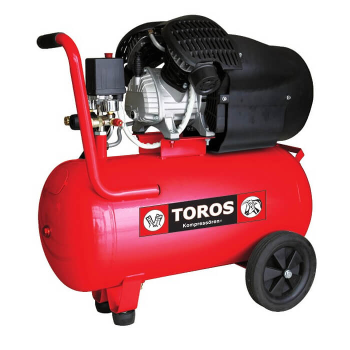 Αεροσυμπιεστής Toros TM50/3. Μονομπλόκ ελαιολίπαντος αεροσυμπιεστής 3 HP με δικύλινδρη κεφαλή τύπου V μεγάλης παροχής αέρα και με αεροφυλάκιο 50 Lt.