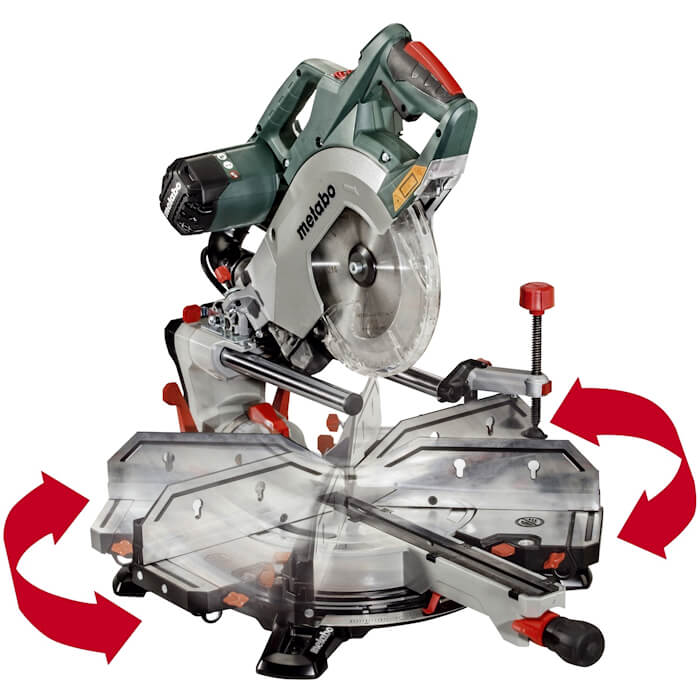- Μέγιστη ελευθερία κατά τη κοπή χάρη στην περιστρεφόμενη βάση και την δυνατότητα κλίσης της κεφαλής και στις δύο πλευρές.