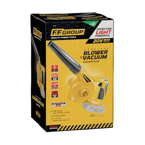 Φυσητήρας - Απορροφητήρας FF Group CAB 20V PLUS μπαταρίας (SOLO), εργονομικά σχεδιασμένο με ελαφρύ σώμα για εύκολη και άνετη χρήση. Στη τιμή δεν συμπεριλαμβάνεται η μπαταρία και ο φορτιστής και συνοδεύεται από 2 χρόνια εγγύηση. Παρέχει δυνατότητα λειτουργίας τόσο σαν φυσητήρας όσο και σαν απορροφητήρας. Η συσκευασία περιλαμβάνει 1 σωλήνα υψηλής πίεσης και 1 σάκο συλλογής.